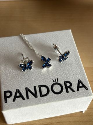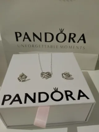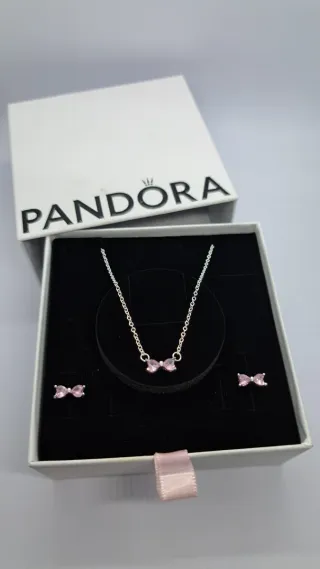 Elegante conjunto de joyería Pandora con diseño de lazo.Elaborado en plata de ley y chapado en PVD.no tengo caja - Pendientes a juego. - Collar a juego. - Detalles brillantes.