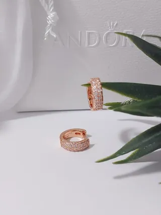 Elegantes pendientes tipo aro de Pandora, con un baño de oro rosa y adornados con circonitas brillantes. - Diseño de aro. - Baño de oro rosa. - Detalles de circonitas.