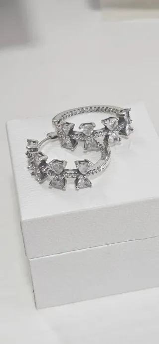 Pendientes grandes de plata 925 con circonitas, diseño elegante y muy vistoso. Son más grandes que los pendientes normales, quedan espectaculares puestos. Nuevos, nunca usados (no llegaron a utilizarse). Estado perfecto. No incluyen caja. Elegantes pendientes de plata 925 con un diseño entrelazado y adornados con circonitas brillantes. - Material: Plata de ley 925. - Diseño: Entrelazado. - Adorno: Circonitas.
