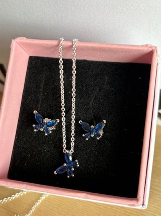 Elegante conjunto de collar y pendientes con diseño de mariposa. - Detalles en forma de mariposa. - Color azul vibrante.