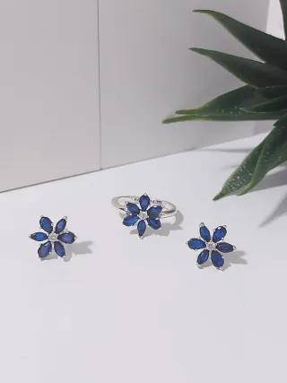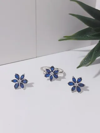 Elegante conjunto de joyería que incluye un anillo y un par de pendientes. - Anillo con piedra azul central. - Pendientes a juego con piedra azul. - Diseño en plata con detalles. - Estilo delicado y moderno.