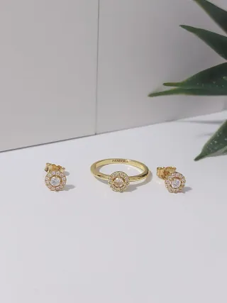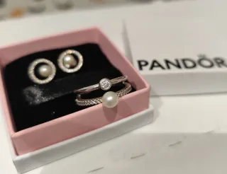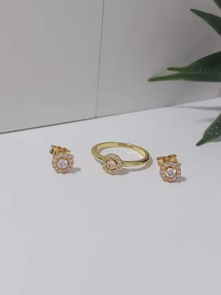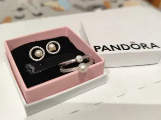 Elegante conjunto de joyería Pandora que incluye pendientes y un anillo. - Pendientes con diseño circular y perla central. - Anillo doble con circonita y perla.