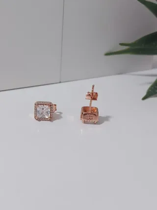 Elegantes pendientes cuadrados de Pandora con un diseño de circonitas brillantes. - Baño de oro rosa. - Diseño con circonitas cúbicas transparentes.