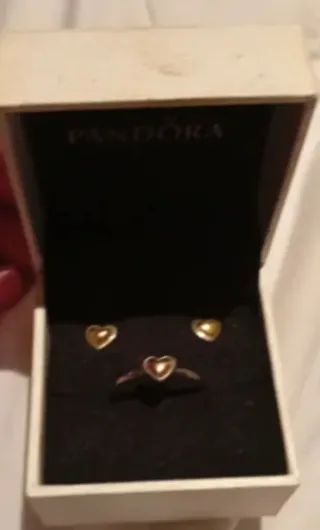 Conjunto de joyería Pandora con diseño de corazón. - Anillo con detalle de corazón. - Pendientes a juego con forma de corazón.