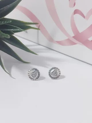 Pendientes Pandora de plata 925 con circonita, diseño de corazón. Nunca usados, estado perfecto. No incluyen caja original. Bonitos y cómodos para uso diario. - Detalle de circonitas cúbicas en el centro. - Grabado de la marca en el borde.