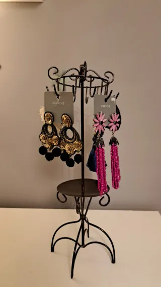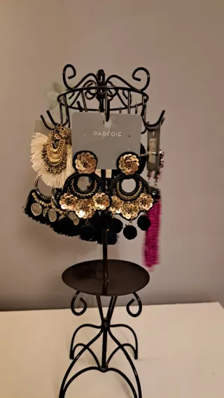 Elegante joyero para organizar tus pendientes. - Diseño de metal negro con detalles dorados. - Soporte para colgar múltiples pares de pendientes. - Base para colocar otros accesorios. Regalo pendientes k salen en la foto. No envio recojer en pau 2