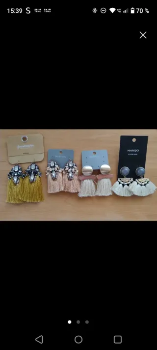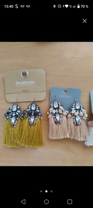 Conjunto de pendientes de las marcas Stradivarius y Parfois. - Pendientes largos con flecos amarillos y detalles de pedrería. - Pendientes largos con flecos en tono rosado y detalles de pedrería. - Pendientes con flecos en tonos beige y detalles metálicos. - Pendientes con forma de abanico y piedra gris. Pendientes de Stradivarius y parafois sin estrenar los otros dos sin cartón son de parafois pero poco usados lote 8€