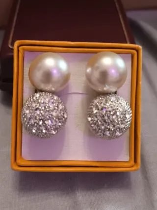 Elegantes pendientes de estilo vintage con perlas y detalles plateados. - Diseño cruzado con circonitas. - Perla central colgante. -plata de ley alta calidad -cierre omega