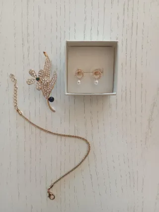Conjunto de bisutería que incluye un broche, pendientes y una pulsera: - Broche adornado con pedrería y detalles en verde y azul marino. - Pendientes circulares con perlas colgantes. -Pulsera dorada con cierre regulable. La pulsera y los pendientes son de Parfois. El broche, no. En perfecto estado.