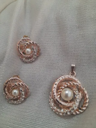 Elegante juego de collar y pendientes vintage. El collar presenta un diseño sofisticado con brillantes y una perla. Los pendientes a juego completan el conjunto. - Collar y pendientes incluidos. - Diseño de inspiración clásica. - Piezas en tono plateado con pedrería blanca.