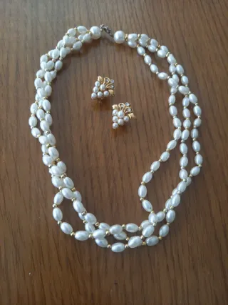 Elegante conjunto de Collar y pendientes de perlas. - Collar de perlas con cierre dorado. - Pendientes a juego también de perlas con diseño de racimo. - Perlas de calidad y esta impecable y en perfecto estado. Ideal para regalo.