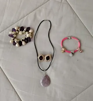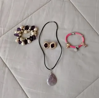 Conjunto de bisutería que incluye pulseras y un collar con pendientes. - Pulsera con cuentas moradas y perlas. - Pulsera rosa con charms. - Collar con colgante de piedra lila. - Pendientes cuadrados con piedra morada, y circonitas.