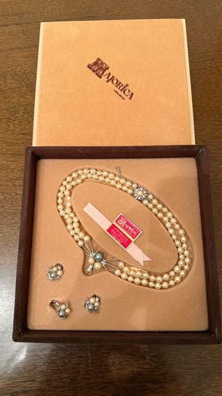 Elegante conjunto de collar y pendientes de la marca Majorica. - Collar de dos vueltas con perlas. - Pendientes a juego con perlas. - Cierre de collar plateado. - Detalle central en el collar con pedrería. - sortija a juego