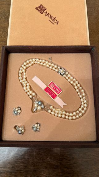 Elegante conjunto de collar y pendientes de perlas de Mallorca. - Perlas de alta calidad. - Cierre del collar dorado. - Presentado en su caja original.
