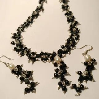 Se venden juntos, no separo. - Mantoncillo rectangular con flecos (hay que peinarlos). - Collar y pendientes con perlas acrílicas blancas. - Flores. Medidas en fotos.