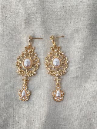 Elegantes pendientes para complementar tu traje de flamenca. Diseño floral con detalles colgantes. - Acabado en dorado. - Adornados con perlas. - Estilo barroco.