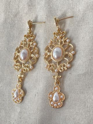 Elegantes pendientes con un diseño detallado y perlas. - Acabado en tono dorado. - Detalle de perlas incrustadas. - Diseño colgante con forma de lágrima.