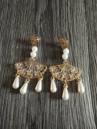 Elegantes pendientes de diseño, perfectos para fiestas o para lucir un estilo flamenco. - Detalle de abanico con filigranas. - Cuentas de perlas blancas. - Colgantes en forma de lágrima.
