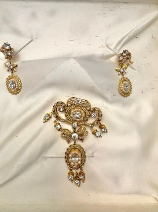 Elegante conjunto de joyería compuesto por un broche y un par de pendientes. - Diseño intrincado con detalles de perlas. - Adornos con piedras transparentes. - Acabado en tono dorado.