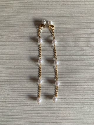 Elegantes pendientes largos con cadena dorada y perlas blancas. - Diseño de cadena fina. - Cuentas de perlas intercaladas. Sin usar. En perfecto estado.
