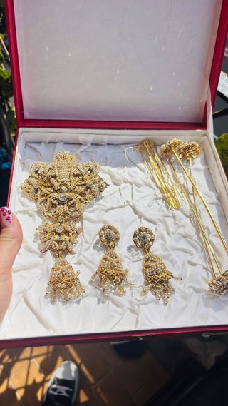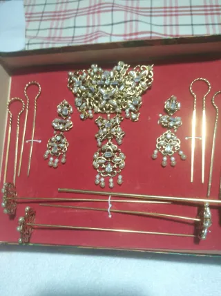Vendo aderezo completo compuesto por pendientes, broche, horquillas y pasadores para el moño trasero. Es un conjunto tradicional, muy favorecedor y con un diseño atemporal. Ha sido utilizado únicamente en dos ocasiones y se encuentra en muy buen estado general. Alguno de los pequeños ganchos presenta una ligera curvatura propia del uso, algo fácilmente ajustable y que no afecta a su colocación ni al conjunto. En su momento fue una pieza de alto valor. Lo vendo por 120€, precio muy ajustado para un aderezo completo en estas condiciones. Ideal para completar tu traje de fallera con un toque clásico y elegante.