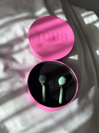 Pendientes largos de la marca Tous con piedras de amazonita y un detalle de rubí. - Diseño elegante y moderno. - Combinación de colores verde y dorado.