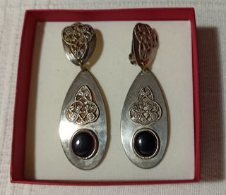 Pendientes de bisutería. Color plateado y piedra negra, de pinza.