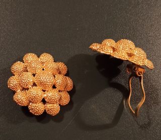 Conjunto de joyas vintage con detalles en tonos dorados y piedras verdes. - Piezas con diseño clásico. - Incluye pendientes y broches. - Estilo retro.