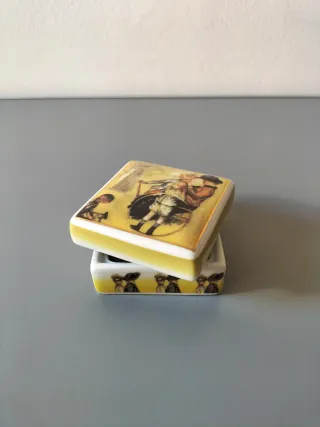 Joyero de cerámica vintage Luarada Renoiz, diseño original del año 2004. Caja joyero cuadrada con ilustración clásica, conserva su caja original, ideal para coleccionistas. Fabricado en cerámica esmaltada, perfecto para guardar anillos, pendientes u objetos pequeños. Una pieza decorativa con encanto, ideal para regalo o colección. Detalles: Marca: Luarada Renoiz Año: 2004 Material: Cerámica Diámetro: 7,2 cm Altura: 4,4 cm Peso: 201 g Incluye caja original Estado: Buen estado vintage, con leves signos del paso del tiempo Ideal para decoración vintage o colección de cerámica.