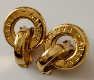 Pendientes de clip vintage Agatha Paris. En metal dorado, tienen forma de picaporte, door Knocker, de una sola pieza, no articulados. Están firmados en aro central "Agatha Paris" y al reverso "Agatha Paris ©". Vintage en muy buen estado, uno de ellos tiene una pequeña marca ( ver fotos). Miden 3 x 2,2 cm. Sin embalaje original.