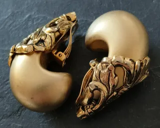 Imponentes pendientes de clip estilo criolla, con un diseño vintage. En resina dorada, con motivos florales en relieve. Son espectaculares. Vintage francés haute couture. Miden 5 x 4 x 1,5 cm. En muy buen estado, pueden tener alguna ligera marca del paso del tiempo ( ver fotos). Sin embalaje original. Recuerdan poderosamente piezas de Kalinger, Jacky de G o Dominique Aurientis.