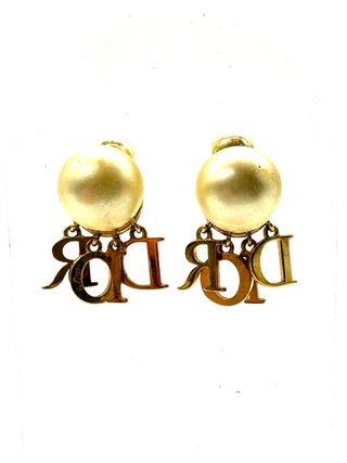 Pendientes de clip Christian Dior vintage con perla dorada y colgantes con las letras “D”, “I”, “O”, “R” en metal dorado, una de ellas con incrustaciones brillantes. Estos pendientes Dior de segunda mano son una joya icónica del mundo de la moda de lujo. Ideales para completar cualquier look elegante con un toque clásico y femenino. En muy buen estado, con leves signos de uso propios de una pieza vintage original de Christian Dior. Perfectos si estás buscando joyas de lujo vintage auténticas y con historia. Barcelona 0559