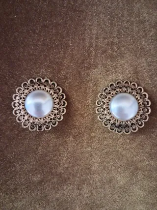 Elegantes pendientes de estilo vintage con una perla central y un delicado diseño de filigrana. - Diseño circular con detalles calados. - Perla de gran tamaño en el centro. - Acabado en tono dorado.