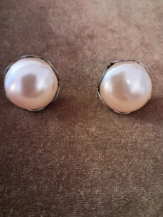 Elegantes pendientes vintage con un diseño de perla en tono rosa y detalles plateados. - Perla grande y brillante. - Montura metálica con acabado plateado. - Estilo clásico y atemporal.