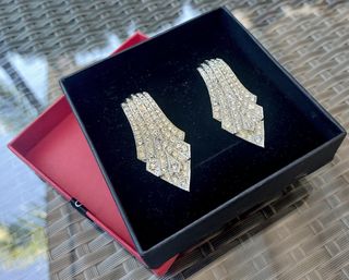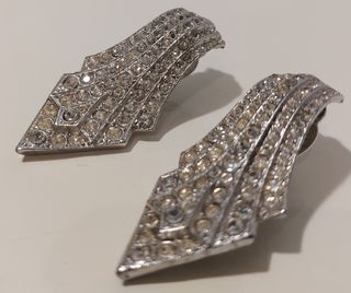 Pendientes vintage, estilo art déco, con circonitas. Están nuevos a estrenar, en perfecto estado. Pendientes de clip vintage, tono plateado, de los años 90. Estos llamativos y esculturales pendientes presentan una silueta geométrica cónica inspirada en el diseño Art Déco, con hileras de circonitas transparentes que reflejan la luz con gran belleza. Elaborados en metal plateado con cierre de clip seguro. Tamaño del pendiente 5 x 2,5 cm. Caja de regalo que sale en las fotos incluida. Perfectos para amantes del glamour vintage. #Pendientes #PendientesVintage #PendientesDiamantes #PendientesCirconitas #PendientesArtDeco #Pendientes