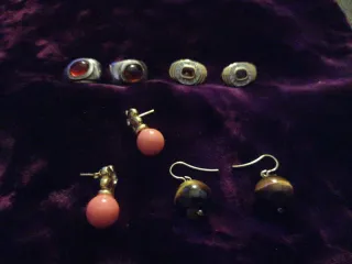 Bisutería vintage pendientes y plata. Dos pares con piedras rosas y marrón ojo de tigre. PRECIO 15€ cada uno - Pendientes dos pares, los dorados cristal morado Los de plata y cristal ambar cierre omega. PRECIO 18€ cada uno