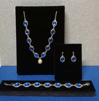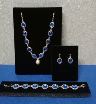 Elegante conjunto de bisutería vintage con un diseño clásico. Incluye collar, pulsera y pendientes. - Diseño con piedras ovaladas de color azul. - Detalle de perla en el colgante del collar. - Cadena y cierres de metal plateado.
