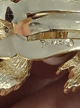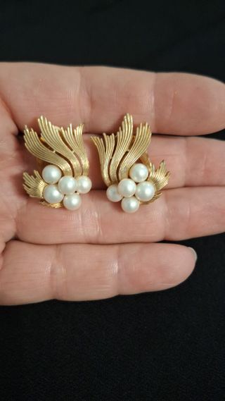 Pendientes vintage de clip dorados, con perlas blancas, tamaño bastante grande, marca Trifari, en buen estado. Se puede enviar o recoger en Tienda Solidaria Piel de Mariposa MARBELLA C/Jacinto Benavente 12 (+ info en la última foto)