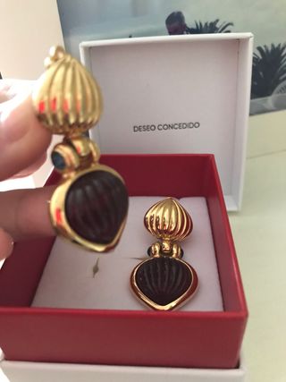 Preciosos pendientes de baturra, chapados en oro de 18k. Son dos pendientes con detalles dorados y piedras rojas. Se aprecian en buen estado. - Diseño elegante y clásico. - Piedras rojas brillantes. - Chapado en oro de 18k.
