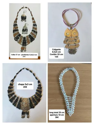 - Collar y pendientes de plata y piedra rosa, creo que es cuarzo ?. Marca plata 925. Pendiente 4 cm, collar 27 cm. En caja de joyería. - Collar y pulsera madera verde - Collar y pendientes abalorios cascada - Collar egipcio y pendientes, egipcio chapa, piedra marrón - Gargantilla negra - Collar elefante ( jade? ), colores años 80 - Conjunto verde con colgante redondo, con colgante rectangular - Collar bicolor, negro esmaltado, búho articulado - Collar y pendiente atrapasueños - Colgante chino, estrella, chino, estrella hilo - Cristales vintage irisados Mando fotos e información detallada