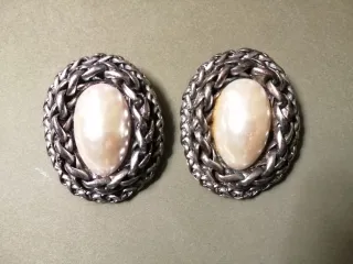 Pendientes vintage de gran tamaño con un diseño inspirado en los años 80. El detalle central es una perla de nácar ovalada. - Diseño ovalado con borde trenzado. - Perla central de gran tamaño. ........ Pendientes vintage años 80's. Tamaño XXL. Centro ovalado con pieza de nácar y exterior trenzado plateado. Cierre de clip. Un capricho para ti, tus fiestas, ceremonias..... O para regalar!!