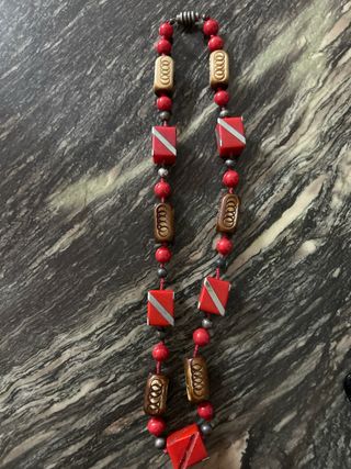 Conjunto de collares de bisutería con un estilo vintage. - Collares con cuentas rojas y marrones. - Collares con cuentas negras y blancas. - Collares con cuentas de madera y metal.