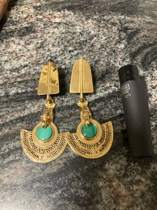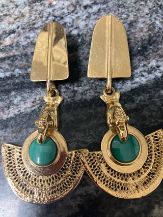 Elegantes pendientes de estilo vintage con detalles dorados y una piedra central de malaquita. - Diseño con inspiración egipcia. - Acabado dorado. - Piedra natural de malaquita.