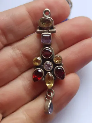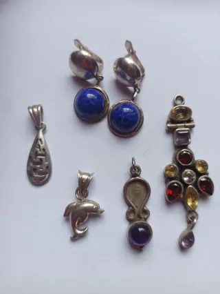 IMPORTANTE: Preguntar disponibilidad antes de comprar. Conjunto de collares y pendientes de plata de ley 925. - Pendientes vintage muy antiguos. - Colgante con forma de delfín. - Colgante con piedra amatista. - Colgante étnico. - Collar con muchas piedras cristales tallados (costó caro).