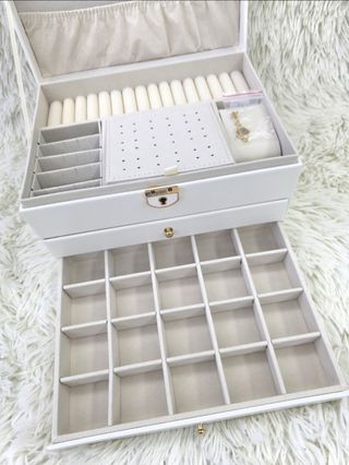 Joyero blanco Nuevo a estrenar Precioso joyero blanco con cierre dorado y llave 1 cajón con 20 compartimentos personalizables 1 cajón con 4 compartimentos personalizables Parte superior con ganchos para colgar collares y meterlos en el bolsillo Compartimento para anillos, pendientes, un reloj, 9 agujeros pequeños personalizables y pendientes colgantes Tamaño Alto 13,5 cm Ancho 22,5 cm Hondo 17 cm