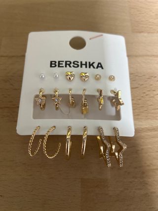 Conjunto de pendientes de la marca Bershka. - Diseño variado con diferentes formas. - Acabado en tono dorado. - Nuevos sin abrir. - Lo vendo a la mitad de su precio original, no acepto ofertas.