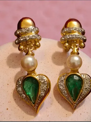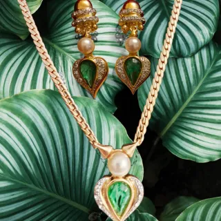 Elegante conjunto vintage de collar y pendientes. - Diseño de corazón con piedra verde. - Detalles en oro y circonitas.