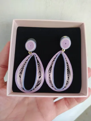 Pendientes artesanales de filigrana con un diseño de vórtice en forma de lágrima. Elaborados con papel quilling. Combinación de tonos lavanda y azul. Cierre de presión. Ligeros, sofisticados y modernos ideal para el día a día o para eventos. Representan movimiento, energía y fluidez (asociado con la transformación interna, la armonía y la espiritualidad). 🔖Nuevos, sin estrenar (incluye caja de regalo y toallita limpiadora)