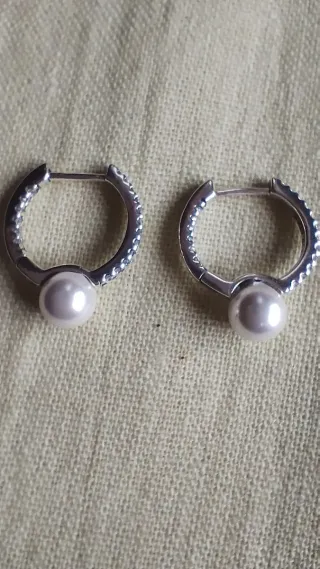 Elegantes pendientes de aro con un diseño clásico y moderno. Perfectos para añadir un toque de sofisticación a cualquier atuendo. - Cierre de presión seguro. - Detalle de pequeñas circonitas en el aro. - Perla central colgante. - Tiene el enganche un poco doblado pero cierra perfectamente. Se han utilizado mucho pero están en perfecto estado. Se mandan con su bolsita de Pandora