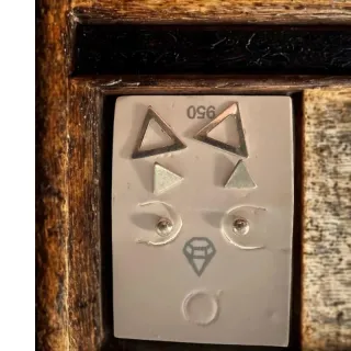 Conjunto de tres pares de pendientes con diseños geométricos. - Dos pendientes con forma de triángulo hueco. - Un pendiente con forma de triángulo macizo. - Dos pendientes con forma de bolita. - Detalle de un diamante grabado en la tarjeta.